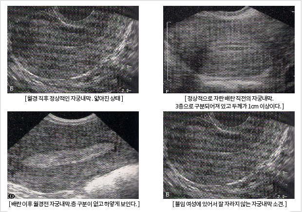 ¿ù°æ ÀÌÈÄ Àڱ󻸷Àº ¾ã¾ÆÁ® ÀÖ°í Ç÷Áß ¿©¼ºÈ£¸£¸ó »ó½ÂÀ¸·Î Á¤»óÀûÀ¸·Î´Â 3ÃþÀÇ »ï°ã»ì¸ð¾çÀÇ ÃþÀ¸·Î ¹è¶õ Àü±îÁö ÀÚ¶ó¾ß ÇÑ´Ù. Åë»ó 5-13mmÀÌ»óÀÌ µÇ¾î¾ß ÇÏ¸ç ¹è¶õ ÀÌÈÄ È²Ã¼ È£¸£¸óºÐºñ·Î ÃÊÀ½ÆÄ ¿µ»ó»ó Á¡Á¡ µÎ²¨¿öÁö¸é¼ ÇϾé°Ô º¯ÇÑ´Ù. ºÒÀÓ ¿©¼º¿¡ ÀÖ¾î¼ Àڱ󻸷ÀÇ µÎ²²°¡ ¾ã°Å³ª ÃþÀÌ ¸íÈ®Áö ¾ÊÀ¸¸ç ´ÜÀÏÃþÀ¸·Î º¸ÀÌ´Â °æ¿ì°¡ ¸¹´Ù.