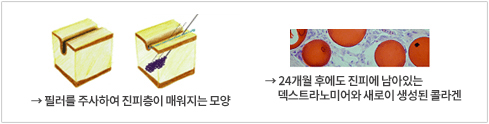 ÇÊ·¯´Â È÷¾Ë·ç·Ð»ê(Hyaluronate/Cross-linked Hyaluronate)À» ±âÁ¸ Á¦Ç° Áß °¡Àå ¸¹Àº ¾çÀÎ 50mg ÇÔÀ¯ÇÏ¿© ÁÖÀÔ ÈÄ ¹Ù·Î È¿°ú¸¦ ³ªÅ¸³»¸ç, Áö¼Ó±â°£ÀÌ ´õ¿í ±æ¾îÁ³½À´Ï´Ù. ÃÖ´ë 4°³¿ù, Æò±Õ 18°³¿ù ¾àÈ¿°¡ Áö¼ÓµË´Ï´Ù. ±âÁ¸ ÇÊ·¯°¡ 6°³¿ù - 1³â ³»¿Ü·Î ¾àÈ¿°¡ Áö¼ÓµÇ´Â °Í¿¡ ºñÇϸé 2-3¹è Áö¼Ó±â°£ÀÌ ´Ã¾î³µ½À´Ï´Ù. ¶ÇÇÑ È÷¾Ë·ç·Ð»êÀÌ ÇǺγ» Èí¼öµÈ ÈÄ¿¡µµ µ¦½ºÆ®¶ó³ë¹Ì¾î´Â ÇǺο¡ ³²¾Æ Äݶó°Õ »ý¼ºÀ» µ½°í 24°³¿ù ÈÄ µ¦½ºÆ®¶ó³ë¹Ì¾î±îÁö ºÐÇØµÇ¾îµµ »ý¼ºµÈ Äݶó°ÕÀÌ ÇǺθ¦ À¯ÁöÇØ ÁÖ¾î ±× È¿°ú´Â ´õ ±æ´Ù°í ÇÒ¼ö ÀÖ½À´Ï´Ù.